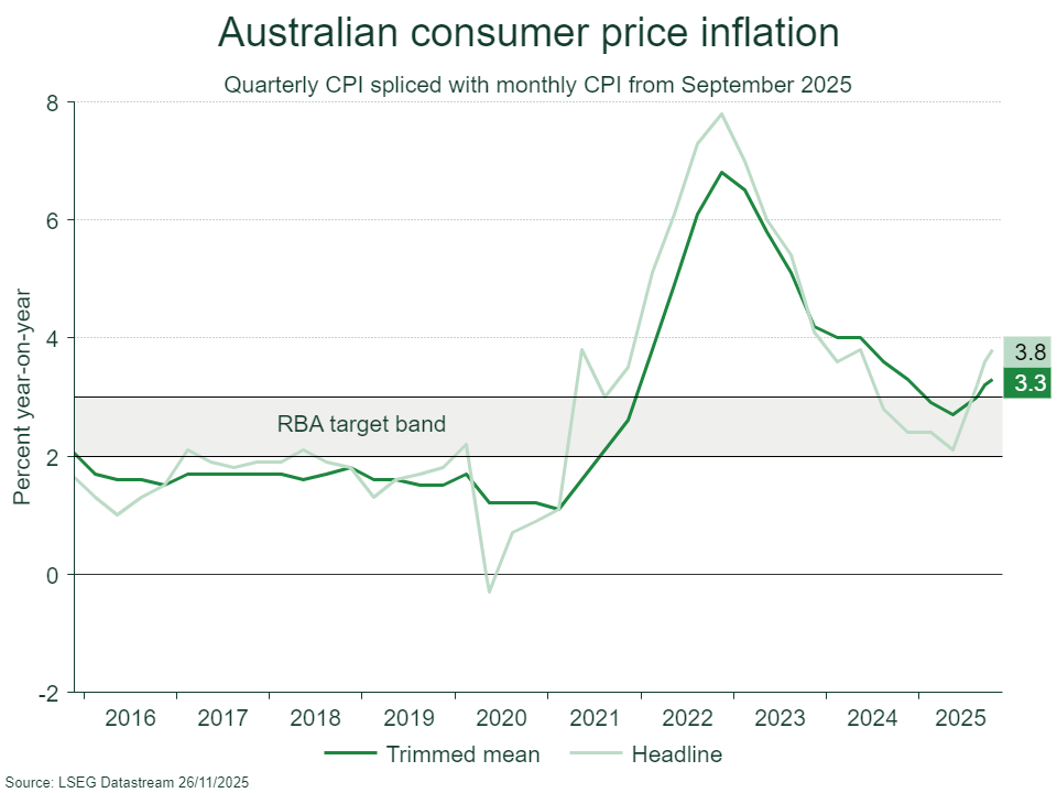The new CPI report confirmed persistent domestic price pressures, with the annual headline CPI rising from 3.5% to 3.8% in the 12 months to October, exceeding economist forecasts. Crucially, the measure of core inflation preferred by the Reserve Bank of Australia (RBA) – the trimmed mean – also rose from 3.2% to 3.3%, drifting further away from the RBA’s 2% to 3% target band.