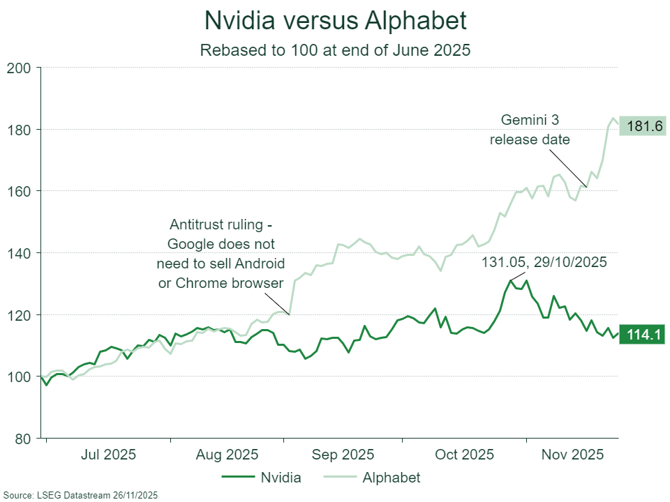 However, the market’s focus has shifted from historical performance to whether Nvidia can continue to dominate the AI chip market in the future, a narrative strongly influenced by Alphabet’s recent success. The launch of Google’s Gemini 3 model last week, may have marked a pivotal moment. Their new large language model (LLM) reportedly outperformed OpenAI’s top GPT-5 in model intelligence across most benchmarks, proving that legacy technology giants can compete with newer, more nimble start-ups like OpenAI when developing frontier AI models.