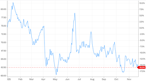 Nonetheless, the head of JP Morgan’s global commodities strategy is confident that producers will almost certainly respond by cutting output once prices fall to levels that threaten their profitability. Reflecting this, JP Morgan has retained its view that Brent Crude oil will remain somewhat range bound between US$55 and US$60 per barrel in 2026 and 2027, assuming proactive supply management. In the event that prices do decline sharply, the bank anticipates that the lower pricing will spur along stronger demand while simultaneously forcing production closures amongst some high cost, non-OPEC+ producers, both of which would help rebalance the market. Regardless, year-to-date Brent Crude oil has already declined 16% amid rising OPEC+ production in the latter half of the year and as JP Morgan has suggested, if there is not disciplined supply management from both OPEC+ and non-OPEC+ producers, global oil markets may be entering a prolonged period of oversupply and structurally lower prices.